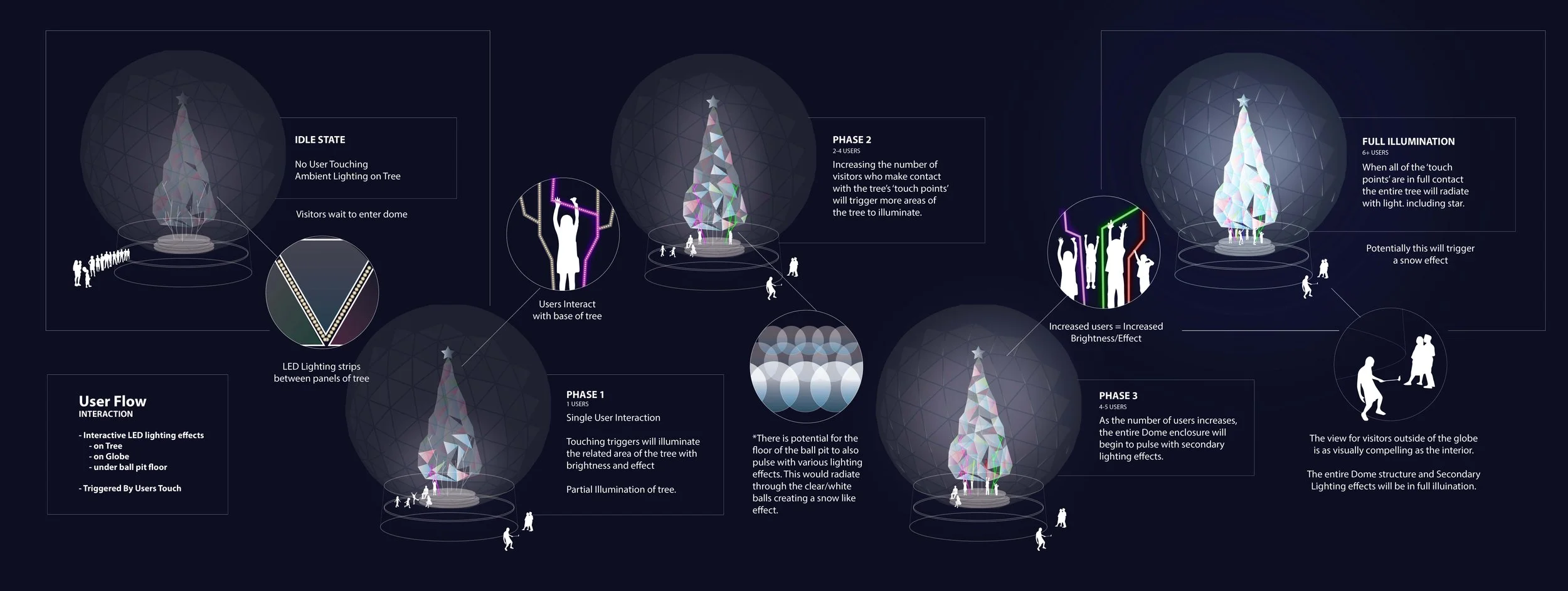 The concept of the installation was to create a winter playground that captured the spirit of Christmas by bringing people together. Inspired by the iconic snow globe, Rolling X invited participants to engage in playful interactions and collaborative experiences. Visitors could touch, play, and explore the installation, triggering light and sound feedback to illuminate the tree and enhance the festive atmosphere. By merging light, sound, and immersive play, Rolling X transformed a public space into a magical holiday dreamscape, inviting families and friends to connect and celebrate. It exemplifies how tangible interfaces and interactive systems can create immersive environments that bring people together, sparking joy and contemplation.